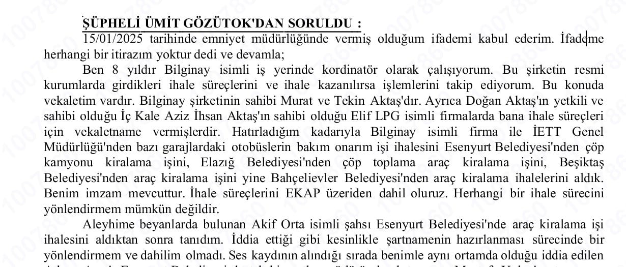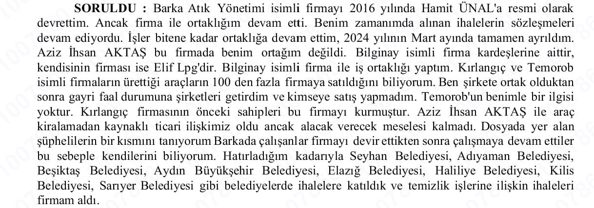 578 sayfalık Aziz İhsan Aktaş iddianamesinde Aktaş’a ait şirketlerinin AKP’li belediyelerden ihale aldığı şüphelilerin ifadelerinde kendi beyanlarıyla savcılık kayıtlarına girmiş.