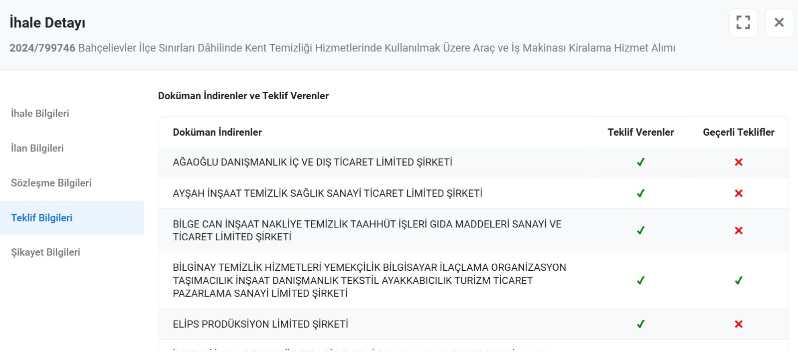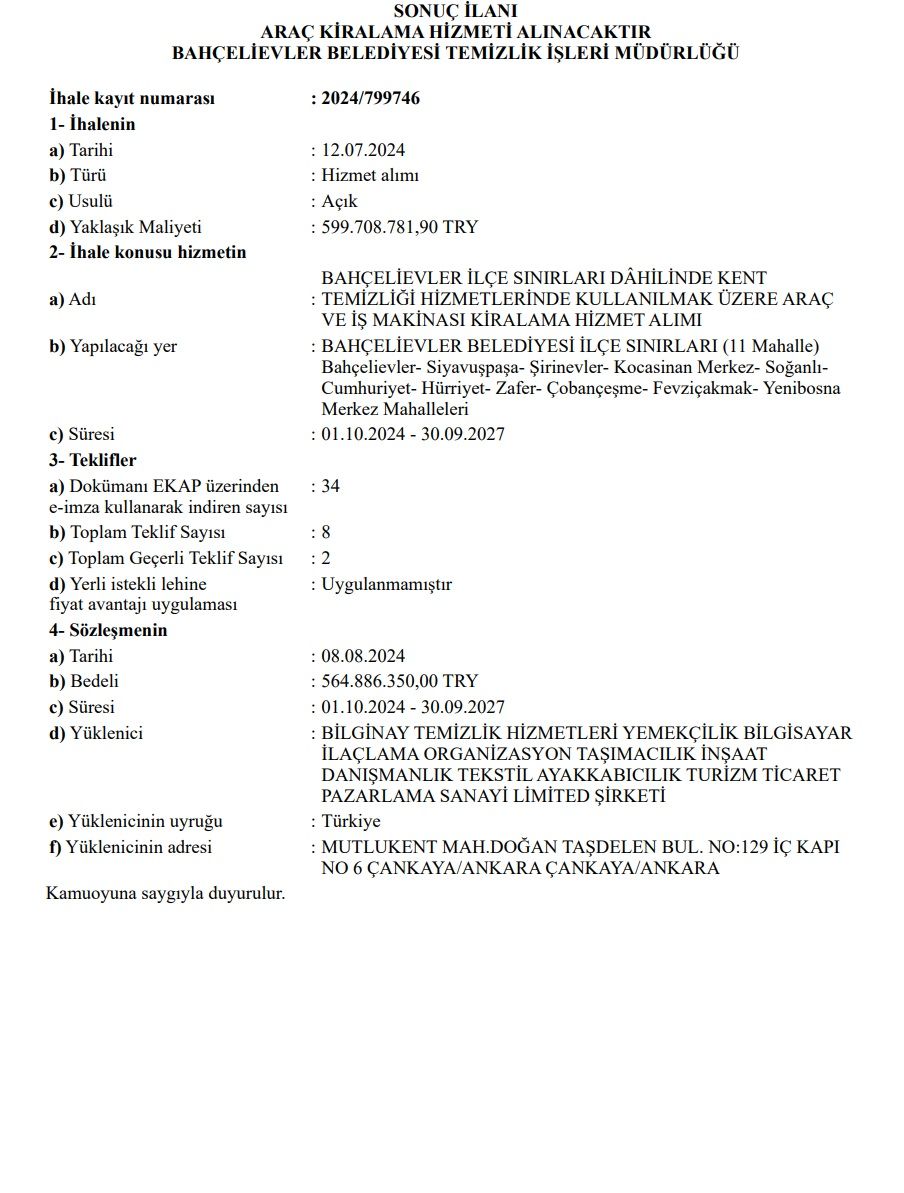Bahçelievler Belediyesi’nin ihalesiBahçelievler Belediyesi’nin 2024 yılının ağustos ayında yaptığı ihalenin detayları ise şöyle; Bahçelievler Belediyesi’nin yaptığı ihaleye 34 firma katılıyor, 8 firma teklif verirken Bilgenay firmasının da arasında olduğu sadece 2 firmanın teklifi geçerli sayılırken Aziz İhsan Aktaş’ın şirketi Bilgenay Bahçelievler Belediyesi’nin temizlik işlerinde kullanılacak araçların ihalesini kazanıyor.